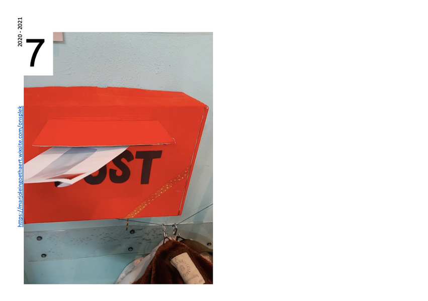 Naast de enveloppen liggen voorbeeldbrieven en postzegels (afgedrukt op etikettenpapier zodat ze deze zelf gemakkelijk kunnen hanteren).